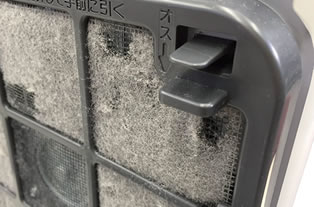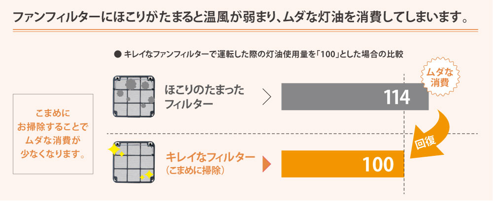 ※3kW機種において、キレイなファンフィルターとほこりのたまったファンフィルターを各々装着し、運転を行なった場合の灯油使用量の差。外気温0℃、設定温度22℃の木造戸建住宅6畳を想定した、当社環境試験室にて3時間運転した場合。